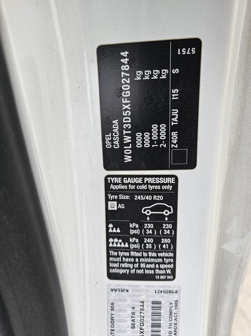 Holden Cascada 2015 CJ 1.6L A16SHL DOHC 16v Turbo Petrol Direct Inj. 4cyl 125kW 2dr Convertible 6sp Auto FWD