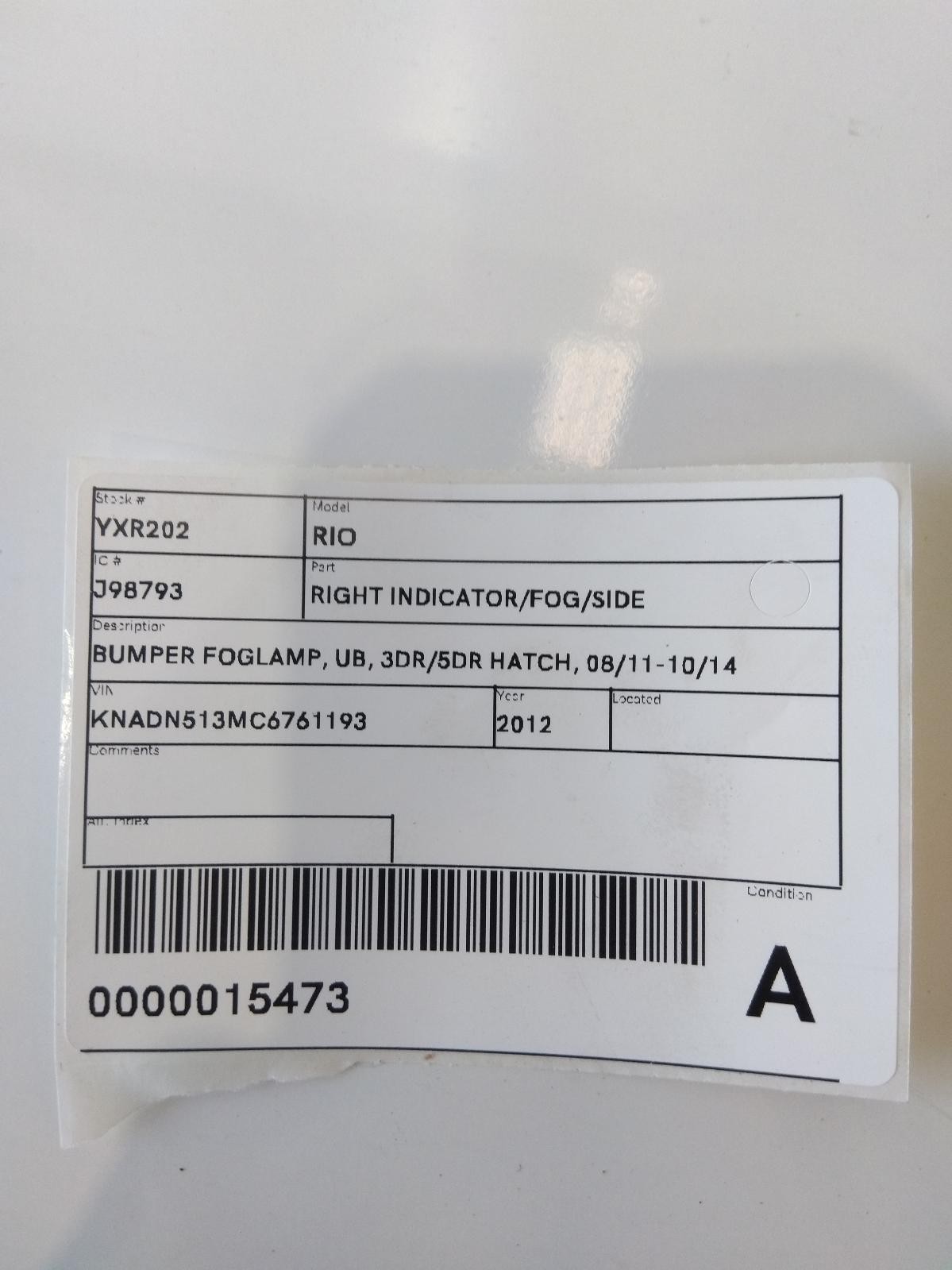 KIA RIO UB 08/2011-10/2014 RIGHT BUMPER FOGLAMP 3DR/5DR HATCHBACK